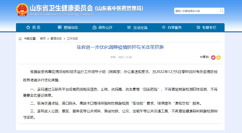 12月4日,山東省衛(wèi)健委發(fā)布消息:根據(jù)省委統(tǒng)籌疫情防控和經(jīng)濟運行工作領導小組(指揮部)辦公室通知要求,自2022年12月5日零時起對有關疫情防控政策措施進行優(yōu)化···