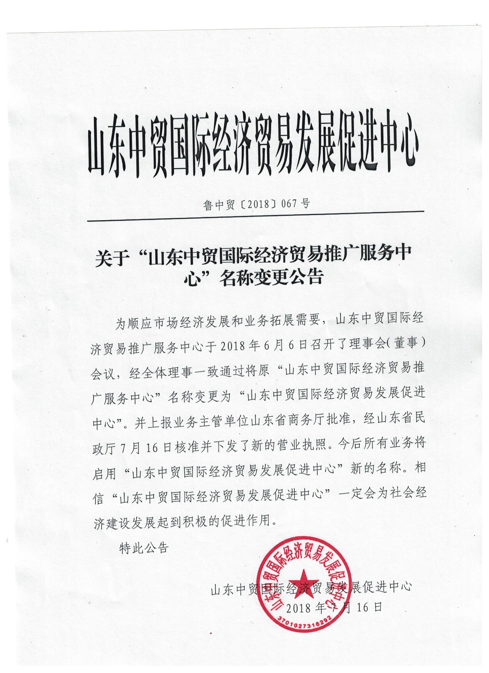 關(guān)于“山東中貿(mào)國際經(jīng)濟(jì)貿(mào)易推廣服務(wù)中心”名稱變更公告