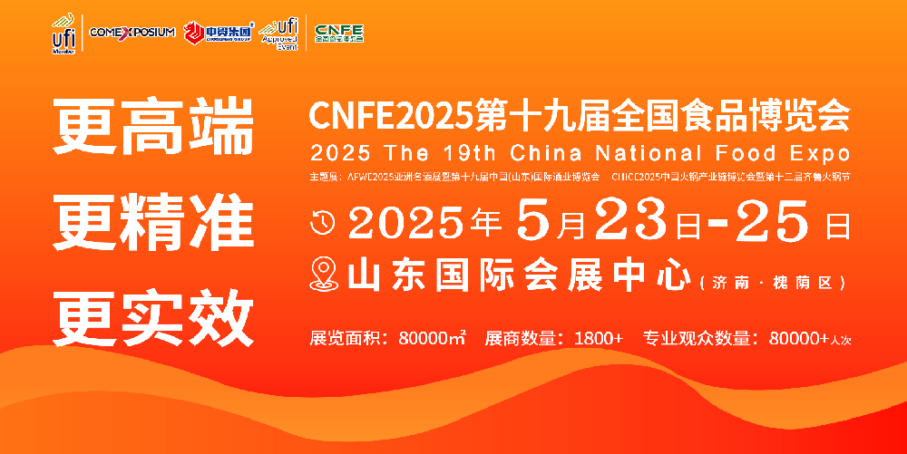 CNFE2025第十九屆全國(guó)食品博覽會(huì)檔期確定!CNFE2025第十九屆全國(guó)食品博覽會(huì),將于2025年5月23-25日在濟(jì)南市山東國(guó)際會(huì)展中心(濟(jì)南市槐蔭區(qū))舉···