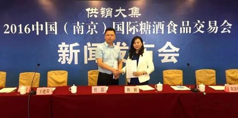 發(fā)布會正式開始之前,海南供銷大集控股有限公司華東區(qū)副總裁韓穎女士與山東中貿(mào)國際經(jīng)濟貿(mào)易推廣服務(wù)中心董事長杜磊先生就“供銷大集”2016中國(南京)國際糖酒會簽署冠名合作協(xié)議。